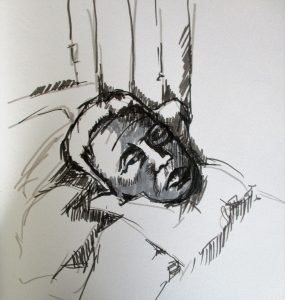 Meine letzte Reise nach Madagaskar war ein Abschiedsbesuch. Dada Richard, mein Adoptivvater aus Antananarivo, im Foto oben ganz links, auf der Zeichnung unten in seinem Krankenbett, wollte mich zum Ende seines Lebens noch einmal sehen. Zwischen beiden Bildern liegen fast 27 Jahre. Ich berichte darüber in einer Erzählung, die spätestens diesen Juni in unserem lang erwarteten Lesebuch Die Kult Maschi’n zu lesen sein wird: Madagaskar, intime Fremde
