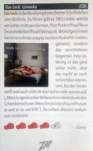 Birkholz Leck(t) und Punk(tet) Juli 21, 2021 | Aktuell | 0 ZAP kommentiert die neue CD von LECK mit den Worten „Da sollten allesamt einfach mal reinhören!“. Dem können wir uns nur anschließen.
