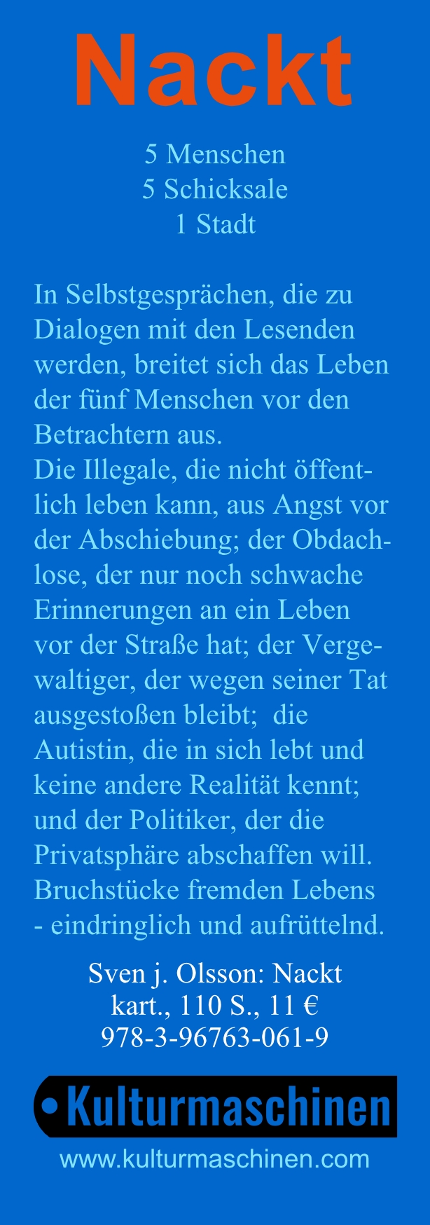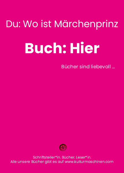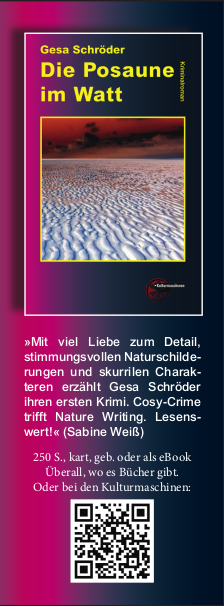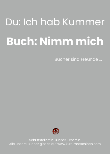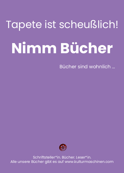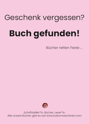 wir, die Kulturmaschinen, sind ein kleiner, aber feiner, Autorenverlag. Als solcher sind wir auch auf Ihre Hilfe angewiesen, damit unsere Bücher den Weg in die Hände der Leserinnen und Leser finden.