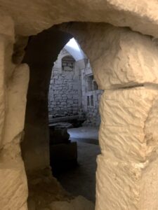 Die Dachterrasse des Hauses mit ihren Treppen und Leitern ist ebenso erstaunlich wie der Untergrund, man glaubt, über die Dächer der ganzen Stadt Lecce gehen zu können und immer neue Geheimnisse zu entdecken. Ein Turm mit Ausguck, gleich darunter der ehemalige Schlafsaal der Nonnen. Dieser ist liebevoll eingerichtet mit persönlichen Gegenständen aus dem Fundus der Besitzer. Bourgeoise Plüschmöbel unbestimmbaren Alters stehen darin, ein Schränkchen mit Heiligenfiguren und Schnapsflaschen en miniature, auf dem Boden eine weitere Vitrine: antike Ton- und Glasbruchstücke neben Weinflaschen aus den 1970er Jahren, alle leer. Im nächsten Saal nüchterne Stuhlreihen und ein pausbäckiger Engelskopf, der leicht verwirrt auf die nicht anwesenden Zuhörer schielt, oder ist es ein Schaden am Stein? Nach dem Ausdruck des Engels zu schließen, spricht der Redner Latein mit einem unbekannten Akzent.