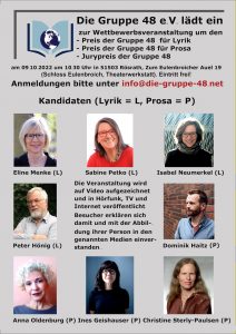Wir drücken die Daumen Aug. 17, 2022 | Aktuell | 0 Unsere Kulturmaschinen Kollegin Christine Sterly-Paulsen gehört zur Endrunde im Wettbewerb 2022 der Gruppe 48 e.V.